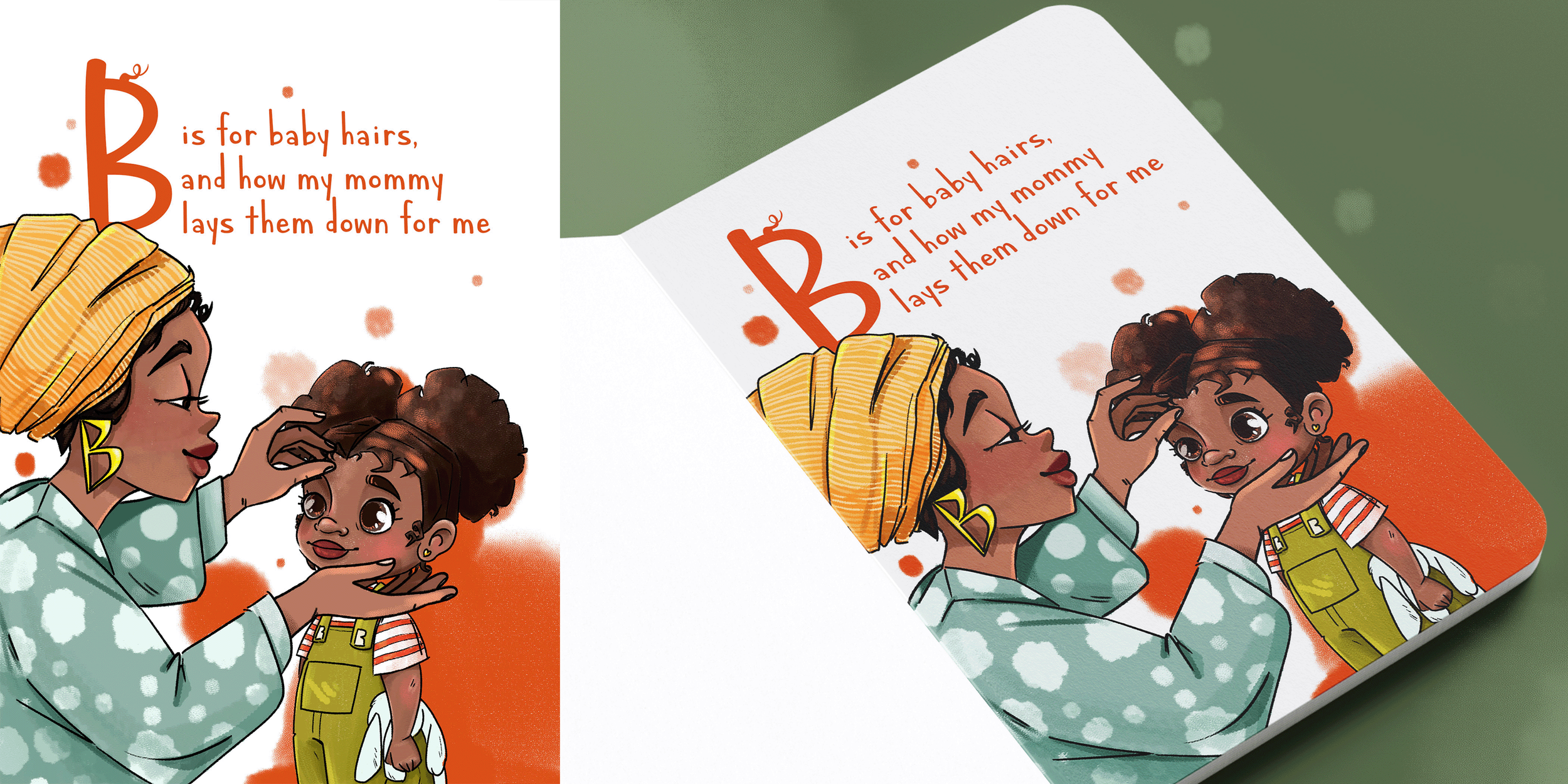 For the “B” spread, I paid special attention to the beauty and individuality of Black hair. As in many of my works, I included a subtle Easter egg: the mother’s golden earring shaped like the letter “b,” and a small hair-inspired detail integrated into the letterform itself—allowing typography and culture to quietly speak together within the image.